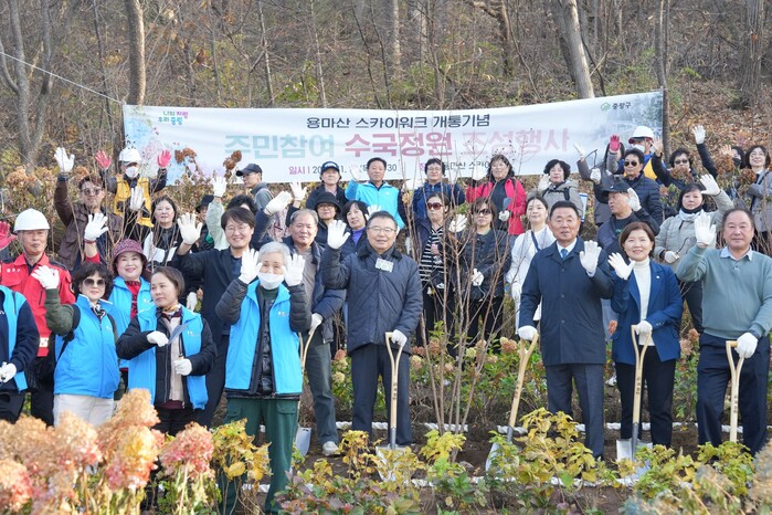 개통식은 13일 오후 류경기 구청장과 지역 주민 50여 명이 참석한 가운데 진행됐으며, 행사와 함께 ‘365일 식목일 나무심기’가 열려 수국 5개 품종과 배롱나무 등 650주의 나무를 심어 스카이워크 인근 정원을 더욱 풍성하게 채웠다.