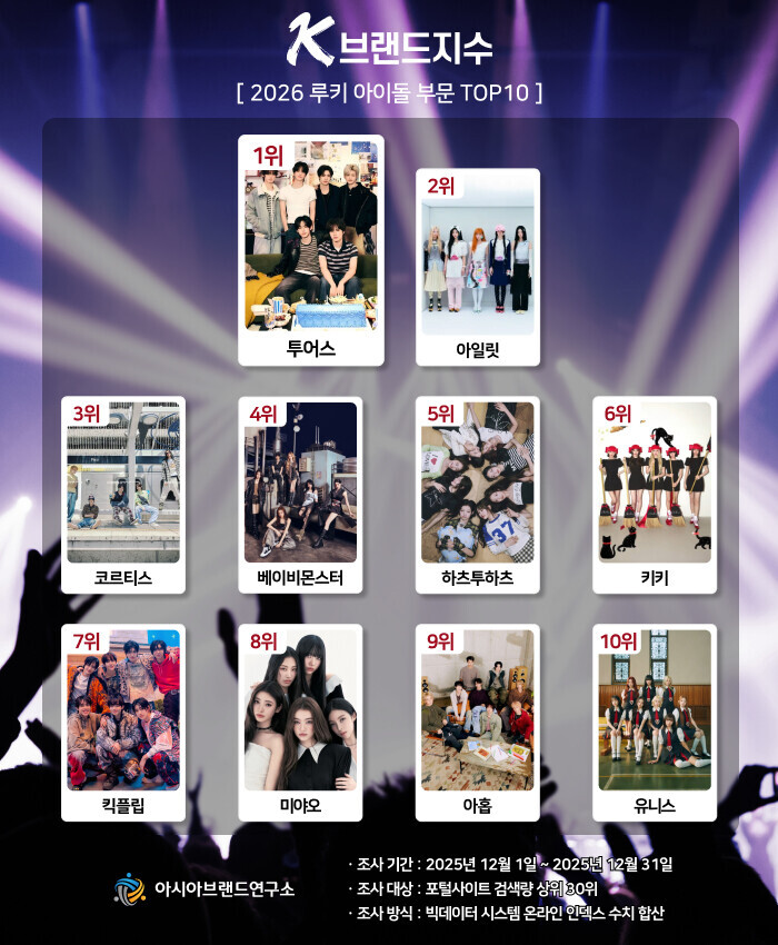 류원선 아시아브랜드연구소 리서치센터장은 “이번 K-브랜드지수 루키 아이돌 부문은 K-팝의 미래를 책임질 '5세대 주자'들의 판도를 가늠할 수 있는 핵심 지표로 평가된다. 영예의 1위를 차지한 투어스는 대중적인 음악과 청량한 콘셉트가 빅데이터상에서 긍정적인 반응을 이끌어냈으며, 2위에 등극한 아일릿 역시 독보적인 스타일로 강력한 팬덤을 구축한 것이 순위에 반영됐다"고 설명했다.