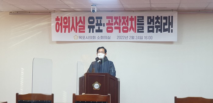 | ▲ 김휴환 목포시의원이 기자회견을 통해 입장을 밝히고 있다.(사진=황승순 기자) |