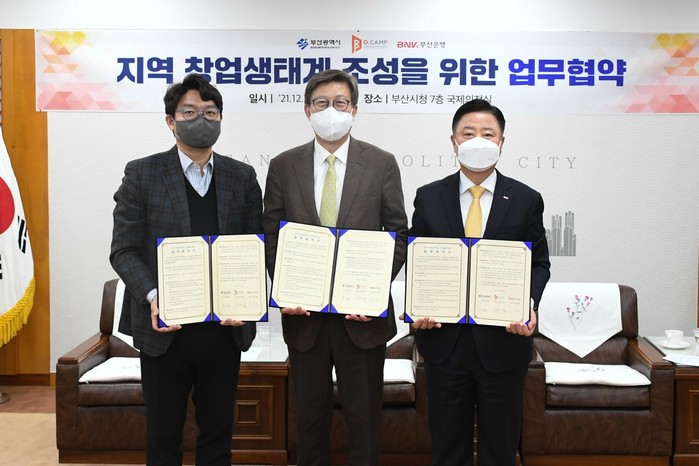 [시민일보 = 여영준 기자] BNK부산은행이 2일 오후 부산시청에서 부산광역시, (재)은행권청년창업재단(이하 디캠프)과 ‘지역 창업생태계 조성을 위한 업무 협약’을 실시했다.