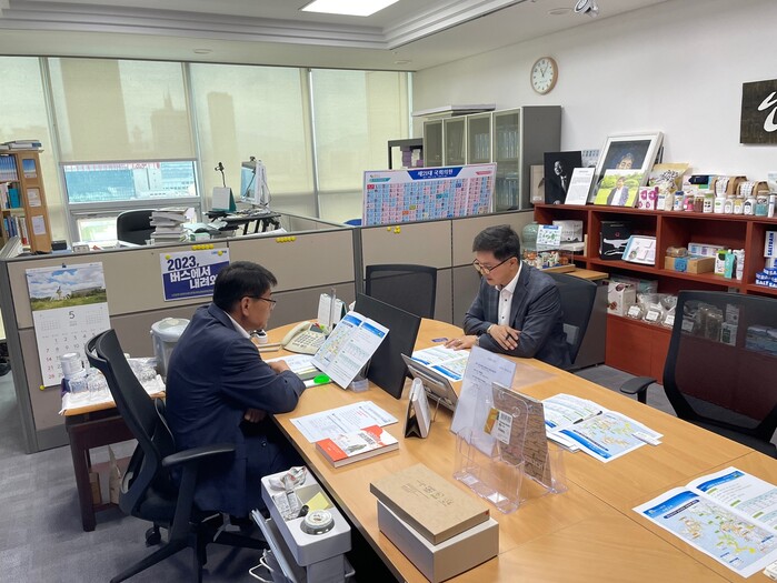 | ▲ 윤영일 단장은 서삼석 국회의원실을 방문해 영산강Ⅳ지구 2024년 예산 건의했다.(출처=농어촌공사 영산강사업단) |
