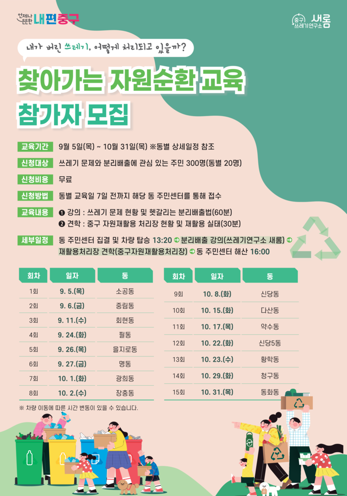 [시민일보 = 여영준 기자] 서울 중구가 5일부터 오는 10월31일까지 주민을 대상으로 ‘찾아가는 자원순환 교육’을 실시한다.
