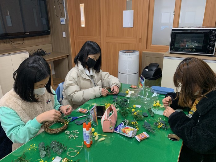 다른 학생은 “꽃리스를 만들어 내 책상위에 걸어 두었더니 크리스마스 분위기로 방안이 환해져서 기분이 좋았어요.” 라고 즐거웠다고 했다.