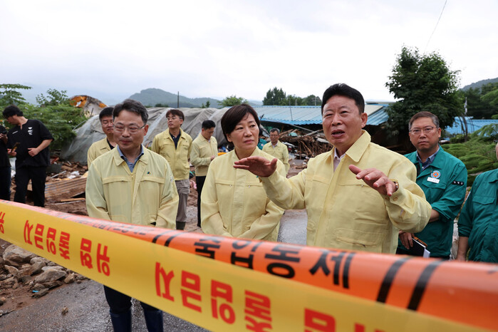 같은 날 오전, 송미령 농림축산식품부 장관도 가평군 일대를 찾아 산사태 피해지와 침수 축산농가를 점검했다. 조종면 신상리에서는 약 300m 구간에 토사가 밀려와 건물 3채가 매몰되고 1명이 사망하는 등 큰 인명 피해가 발생했다. 상면 항사리 목장에서도 젖소 94마리 중 31마리가 유실되는 등 축산농가 피해가 컸다.