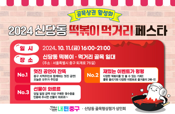 [시민일보 = 여영준 기자] 서울 중구가 오는 11일 신당동 떡볶이·먹거리 골목에서 ‘신당동 먹거리 페스타’를 개최한다.