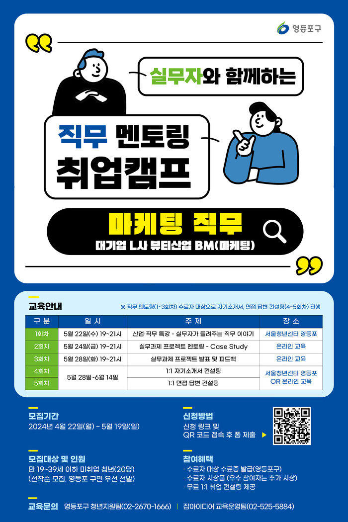 ’직무 멘토링 취업 캠프’는 오는 22일, 1기 마케팅 과정을 시작으로 직무별로 순차적으로 진행된다. 이번 1기 마케팅 과정은 대기업 뷰티업계의 현직자와 함께 상품기획, 전략, 트렌드 분석 등 실제 현장에서 마주하는 다양한 과제를 통해 기업이 원하는 역량을 쌓는다. 추후 구는 국제 금융 중심지로서, 금융권 취업을 희망하는 청년을 위한 과정도 선보일 예정이다.