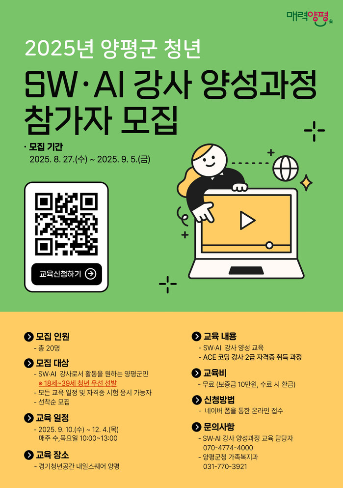 이번 교육은 소프트웨어(SW)·인공지능(AI) 교육 역량을 갖춘 전문 강사를 양성하기 위한 실무 중심의 프로그램으로, 경기청년공간 내일스퀘어 양평(양평읍 양근로 196)에서 9월부터 12월까지 4개월간 진행된다.
