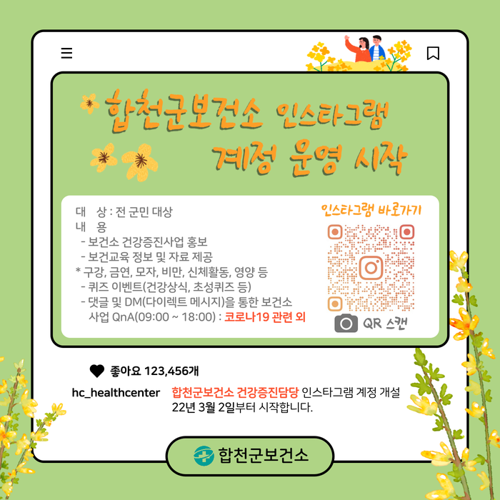 이외에도 매월 건강 상식과 관련된 퀴즈이벤트를 개최하고 정답자에게는 추첨을 통해 건강증진 기념품도 제공할 예정이다. 참여를 원하는 군민은 인스타그램 검색창에서 ‘합천군보건소’를 검색하거나 안내문에 있는 QR코드 사진 촬영으로 해당 채널 확인 및 이동할 수 있다.