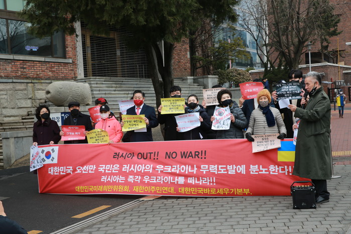 이날 시위는 황태영 홍보본부장의 “러시아는 즉각 우크라이나를 떠나라” 등의 구호제창에 이어 재한이주민연대 이선 대표의 성명서 낭독 순으로 진행됐다.