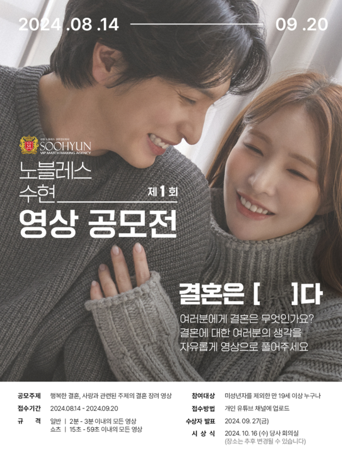 노블레스 수현은 8월 14일(수)부터 9월 20일(금)까지 ‘행복한 결혼, 사랑에 관한 결혼 장려 영상’을 주제로 한 영상과 숏폼을 접수 받는다. 영상은 개인 유튜브 채널에 업로드하고 업로드 시 제목에 ‘수현 영상 공모전’을 필수로 삽입해야 한다. 이후 네이버 폼을 통해 신청서와 영상 링크를 제출하면 접수가 완료된다. 영상 규격은 일반 영상은 3분 이내, 숏츠의 경우 15~59초다.