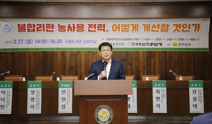 국회 농림축산식품해양수산위원회 서삼석 의원(더불어민주당, 영암 무안 신안)은 27일‘불합리한 농사용 전력, 어떻게 개선할 것인가’토론회를 주최하는 자리에서 이같이 밝혔다. 이날 행사는 국회 도서관 소회의실에서 오후 2시에 개최 됐다.