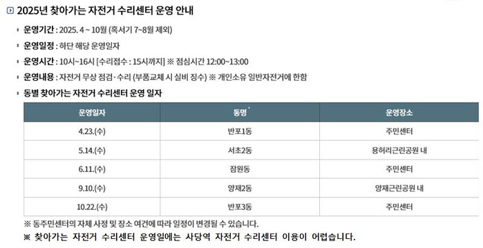 | ▲ 찾아가는 자전거 수리센터 운영 일정. (사진=서초구청 제공) |