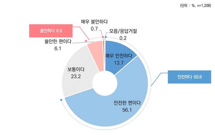 생활안전 분야에서 도민이 체감하는 현재 거주지역의 안전도 조사에는 응답자의 69.8%가 안전하다고 답했다.