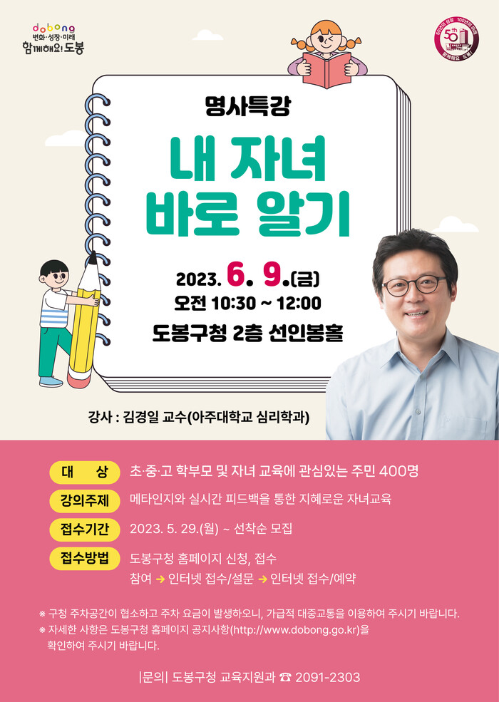[시민일보 = 여영준 기자] 도봉구(구청장 오언석)가 관내 학부모들의 자녀 이해와 교육에 도움을 주기 위해 오는 6월9일 오전 10시30분부터 90분간 구청 2층 선인봉홀에서 ‘내 자녀 바로알기-명사특강’을 진행한다.