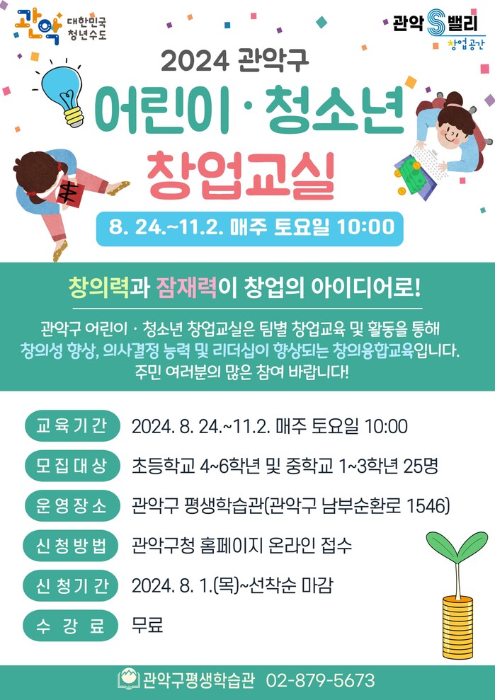 구는 관악구 평생학습관에서 오는 24일부터 11월 2일까지 총 10회에 걸쳐 어린이-청소년 창업교실을 진행한다.