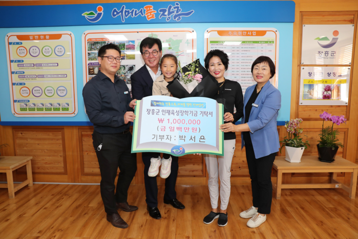 [장흥=황승순 기자](재)장흥군인재육성장학회(이사장 김성)는 29일 박서은(8세, 목포대연초) 양이 1백만원을 기부했다고 밝혔다.