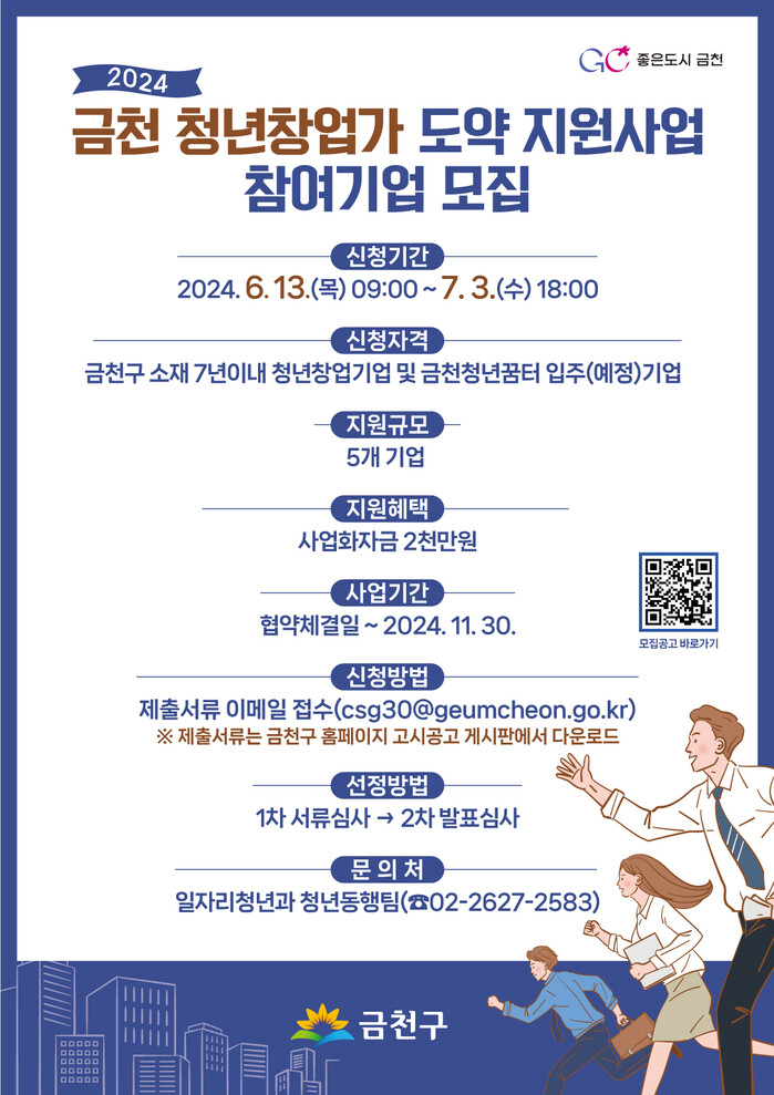 [시민일보 = 여영준 기자] 서울 금천구(구청장 유성훈)는 오는 7월3일까지 ‘금천 청년창업가 도약 지원사업’ 공모에 참여할 청년창업기업 5개 사를 모집한다고 밝혔다.