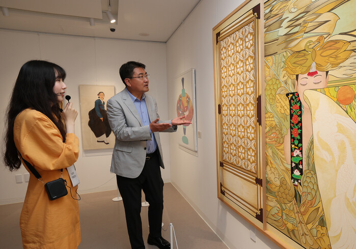 | ▲ 오승록 구청장이 4일 오후 서울 노원구 불암산 힐링타운 내 불암산아트포레 갤러리를 방문해 민화작가 오순경 개인전 ‘오색향연’ 전시를 관람하고 있다. (사진=노원구청 제공) |