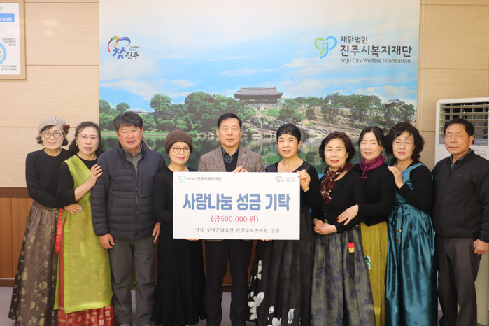 경상남도 무형유산 한량무 보존회(회장 박옥란) 회원은 29일 지역 내 어려운 이웃을 돕기 위해 성금 50만 원을 진주시복지재단(이사장 이성갑)에 기탁했다.