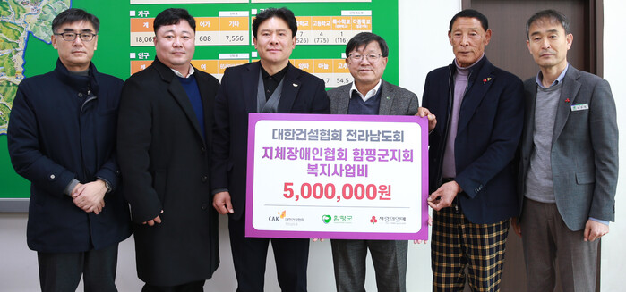 [함평=황승순 기자]대한건설협회 전라남도회(회장 박경재)가 20일 함평군 지체장애인협회(지회장 박종관)에 써달라며 함평군에 복지사업비 500만 원을 기탁했다.