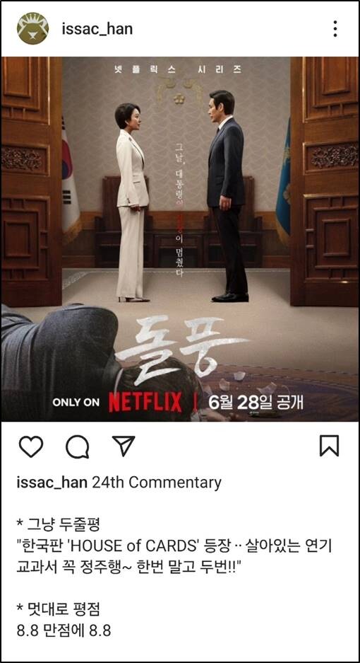 이와 관련해 문화평론가 한정근은 자신의 인스타그램에 "한국판 'HOUSE of CARDS' 등장···살아있는 연기 교과서 꼭 정주행~ 한번 말고 두번!!"이란 게시물을 올려 눈길을 끈다.