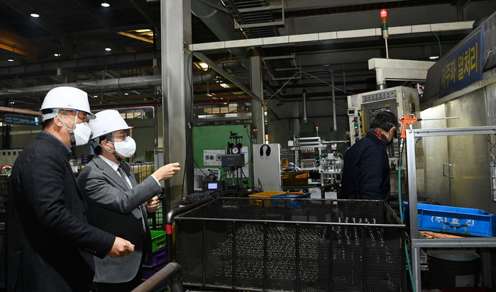 | ▲ 충남 아산 소재 장인열처리(주)를 방문한 정승일 사장의 모습.(사진제공=한전) |