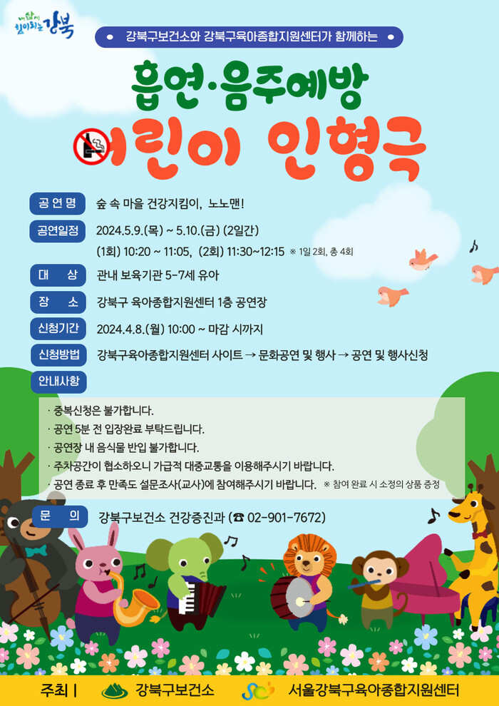 [시민일보 = 여영준 기자] 서울 강북구(구청장 이순희)는 오는 9~10일 강북구 육아종합지원센터 1층 공연장에서 어린이집 및 유치원 5~7세 아동 약 800명 대상으로 흡연·음주예방 어린이 인형극 '숲속 마을 건강지킴이 노노맨'을 공연한다.