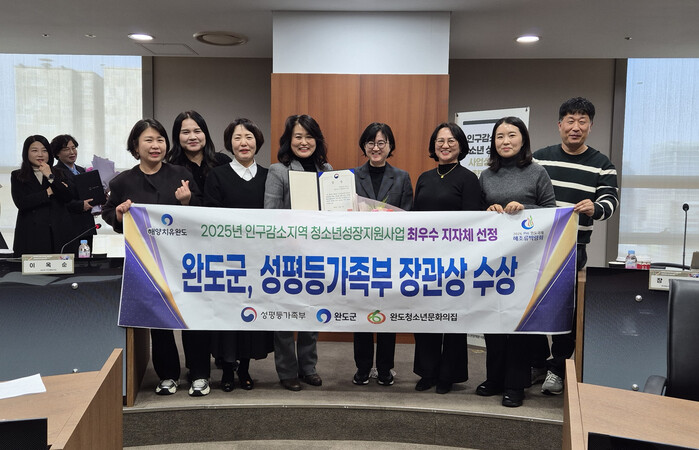 [완도=김현종 기자]완도군이 「2025년 인구 감소 지역 청소년 성장 지원 사업」 시행 첫해 최우수 지자체로 선정되어 성평등가족부 장관상을 수상했다.