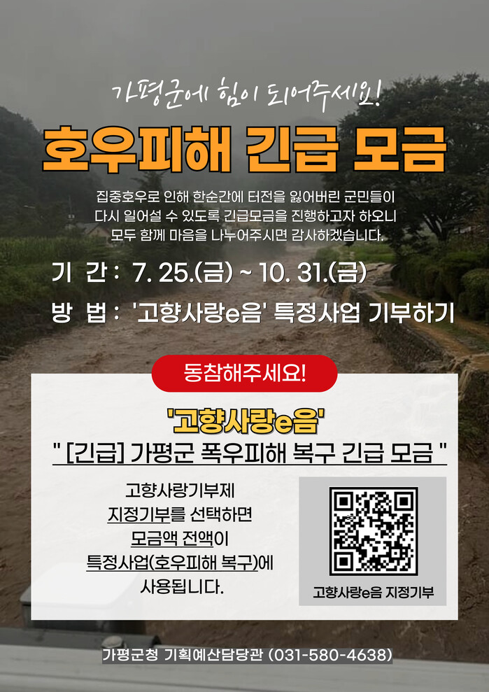 가평군 관계자는 “삶의 터전을 잃은 군민들을 위한 복구가 시급한 상황”이라며 “고향사랑기부제를 통해 실질적인 연대와 온정이 모일 수 있도록 많은 관심과 참여를 부탁드린다”고 말했다.