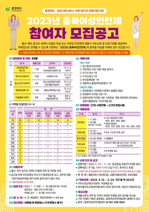 신청자격은 공고일 현재 취업하지 않고, 주민등록상 주소지가 충청북도에 있으며, 공무원 채용기준에 결격사유가 없는 여성이면 지원 가능하다.