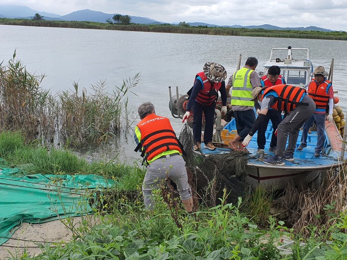 | ▲ 한국농어촌공사 영산강사업단은 영암호 어업공동체와 합동으로 폐어망 수거를 실시했다.(출처=농어촌공사 영산강사업단) |