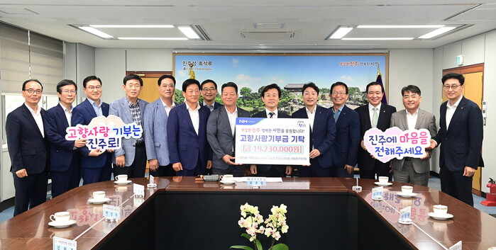 진주시는 11일 시청 기업인의 방에서 거제시 농협 임직원 190여 명이 동참한 고향사랑기부금 1923만 원을 기탁받았다고 전했다.