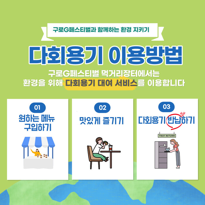 구로구는 이번 행사에 다회용기 사용을 처음 도입한다. 이용객은 다회용기에 담긴 음식을 즐기고 사용한 용기를 전용 반납부스에 직접 반납하면 된다. 반납된 용기는 전문세척업체에서 세척한 후 검수 단계를 거쳐 재사용된다.