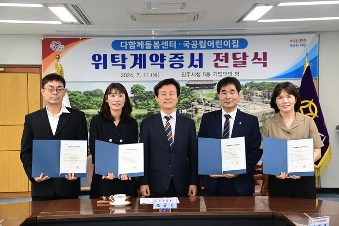 진주시는 11일 시청 기업인의 방에서 다함께돌봄센터 2개소 및 국공립어린이집 2개소 수탁운영자와 위탁계약증서 전달식을 가졌다.