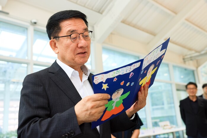| ▲ 문헌일 구청장이 딸기 모종 심기 체험 행사에서 어린이집 원아들이 준비한 편지를 읽고 있다. |