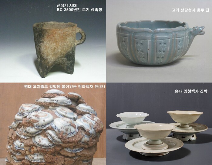 | ▲ 보성군, 4월 29일부터 중국 신농시대 ~ 18세기까지 다구 전시회 개최_(신석기 시대 BC 2500년전 토기 삼족정,고려 상감청자 용두 잔, 명대 요지출토 갑발에 붙어있다.(출처=보성군) |