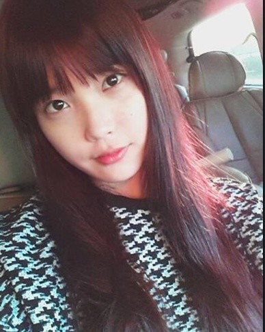 사진 속 아이유는 긴 생머리에 앞머리를 내리고 사진을 찍고 있다.