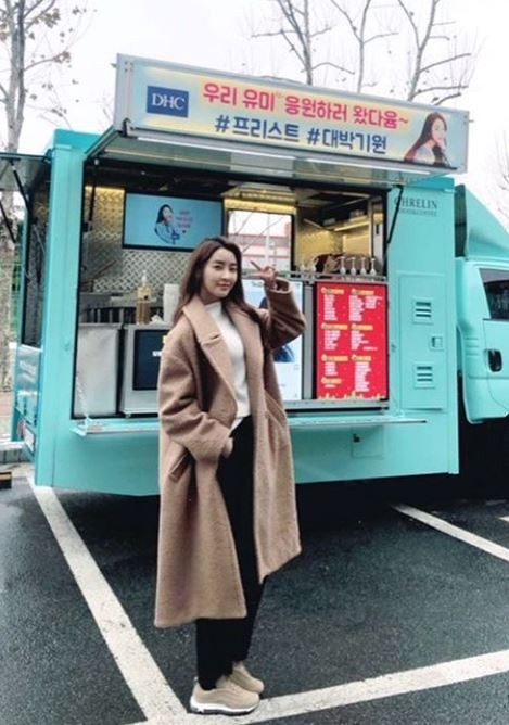 공개된 사진에는 '프리스트'에 출연 중인 정유미를 응원하기 위한 현수막이 달린 커피차가 도착해 있다. 고마움을 표시하기 위해 그가 직접 인증 사진을 남긴 것이다.
