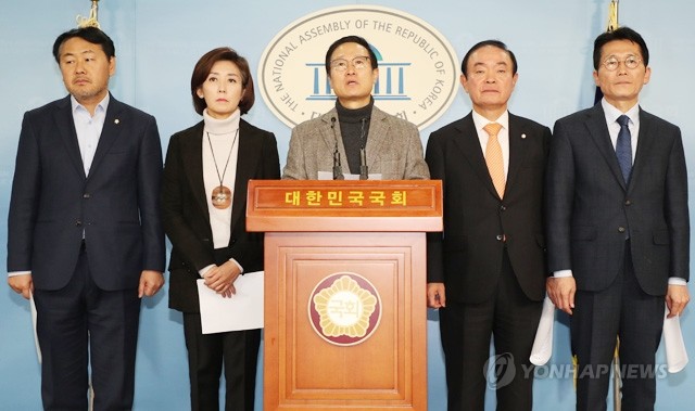 여야 5당 원내대표가 15일 오후 국회 정론관에서 연동형 비례대표제 도입 검토를 합의한 것과 관련해 기자회견을 하고 있다. 왼쪽부터 바른미래당 김관영 원내대표, 자유한국당 나경원 원내대표, 더불어민주당 홍영표 원내대표, 민주평화당 장병완 원내대표, 정의당 윤소하 원내대표.