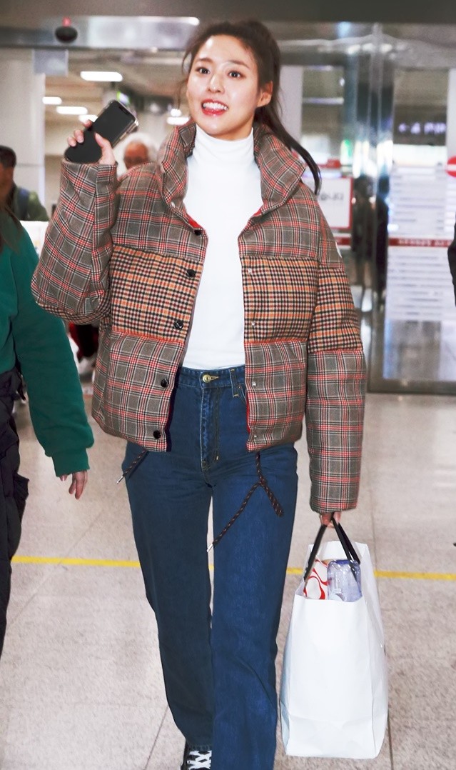 여기에 글랜체크 패턴이 배색된 다운 재킷을 포인트로 감각적이고 캐주얼한 무드의 공항패션을 완성했다.