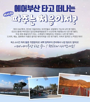 에어부산은 여행박사, 삼성여행사와 함께 부산에서 출발하는 DMZ 여행 상품을 선보인다. 당일치기와 1박 2일 코스로 구성된 상품은 임진각, 제3땅굴, 도라전망대, 임진강변 생태탐방로, 헤이리 마을 등 파주 일대 관광지를 두루 둘러볼 수 있으며 파주에서 꼭 먹어봐야 하는 장단콩 식사가 포함된 알찬 일정을 제공한다.