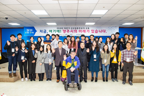 경기 양주시는 지난 13~14일 양일간 시청 대회의실에서 ‘2018년 하반기 신규임용후보자 교육’을 실시했다. 교육 대상자는 올해 지방직 임용시험에 합격해 각 부서에서 실무수습 중이거나 이달 중 임용 예정인 예비공무원 33명이다. 사진은 이성호 시장 및 관계자들이 기념촬영을 하는 모습. (사진제공=양주시청)