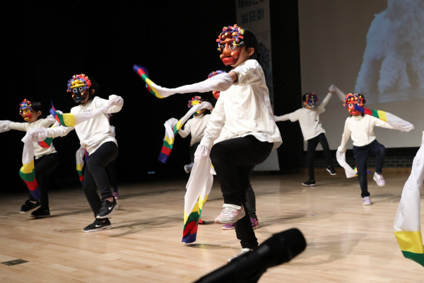 서울 성동구는 최근 제2서울창의예술교육센터에서 문화예술체험센터 작품전시 및 발표회 ‘성동 문화로(路) 예술로(路)’를 개최했다. 이번 발표회에서는 전통예술 등의 각종 공연이 펼쳐졌다. 사진은 학생들이 전통탈춤 공연을 하는 모습. (사진제공=성동구청)
