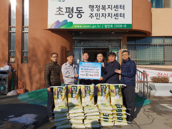 경기 오산시 조흥운수(주)는 최근 초평동행정복지센터에 지역의 어려운 이웃 등을 위해 써 달라며 세마쌀(10kg) 30포를 전달했다. 이날 전달식에는 조흥운수 번영회 조근호 회장을 비롯한 회원들이 함께 했다. 사진은 전달식에서 기념촬영하는 모습. (사진제공=오산시청)