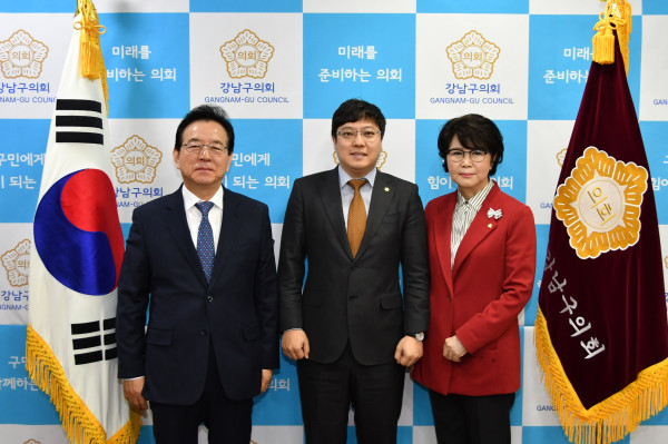 17일 열린 서울 강남구의회 제272회 정례회 제3차 본회의에 앞서 이관수 의장, 이재민 부의장은은 의장실에서 정순균 강남구청장과 차담회를 열고 편안한 분의기에서 구 현안 사업 등에 대해 의견을 나눴다. 사진은 차담회 후 기념촬영을 하고 있는 정 구청장(왼쪽)과 이 의장(가운데), 이 부의장의 모습. (사진제공=강남구의회)