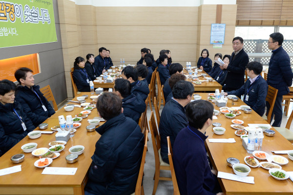 인천 연수구는 17일 청내 구내식당에서 연수구시설관리공단 소속 미화관리원 15명 등 청사관리 직원 26명을 초청해 오찬 간담회를 진행했다. 사진은 고남석 구청장이 참여자들과 이야기를 나누고 있는 모습. (사진제공=연수구청)