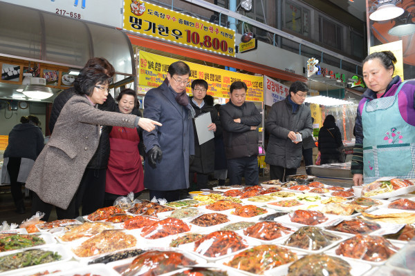 박래헌 경기 수원시 영통구청장은 18일 연말을 맞아 지역내 전통시장 활성화와 이웃사랑 실천을 위해 '구매탄시장'을 찾았다. 이날 박 구청장을 비롯한 직원 20여명은 전통시장 활성화를 위해 온누리 상품권으로 육류·과일·밑반찬 등을 구입했으며, 구입한 물품은 매탄 지역아동센터의 어린이들을 위해 기증했다. 사진은 박 구청장 및 직원들이 밑반찬을 고르고 있는 모습. (사진제공=수원시청)