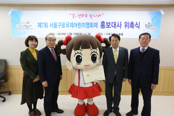 최근 ‘제7회 구로국제어린이영화제’ 홍보대사로 애니메이션 <안녕 자두야>의 주인공인 ‘최자두’가 위촉됐다. 사진은 18일 구청 소통홀에서 열린 위촉식에서 최자두와 기념촬영을 하고 있는 이성 구청장(오른쪽에서 두 번째)과 관계자들의 모습. (사진제공=구로구청)