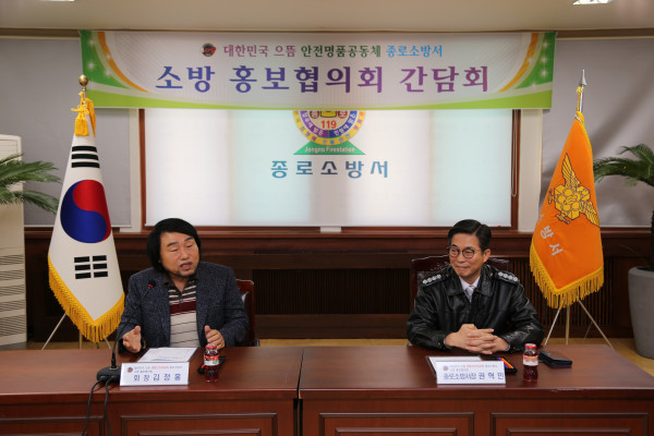 종로소방서는 지난 18일 3층 회의실에서 소방홍보협의회 최원들을 초청해 간담회를 개최했다. 종로소방서 소방홍보협의회는 김정홍 엘가모아 대표이사를 위원장으로 각계 홍보 전문가 10여명으로 구성되어 있다. 사진은 권혁민 서장과 김정홍 위원장이 이야기를 나누는 모습. (사진제공=종로소방서)