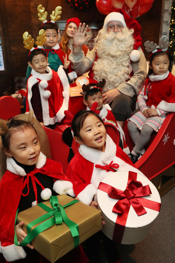 20일 오전 서울 광진구 워커힐호텔에 마련된 '산타의 캐빈' 포토존에서 핀란드 공인 산타와 어린이들이 포즈를 취하고 있다.